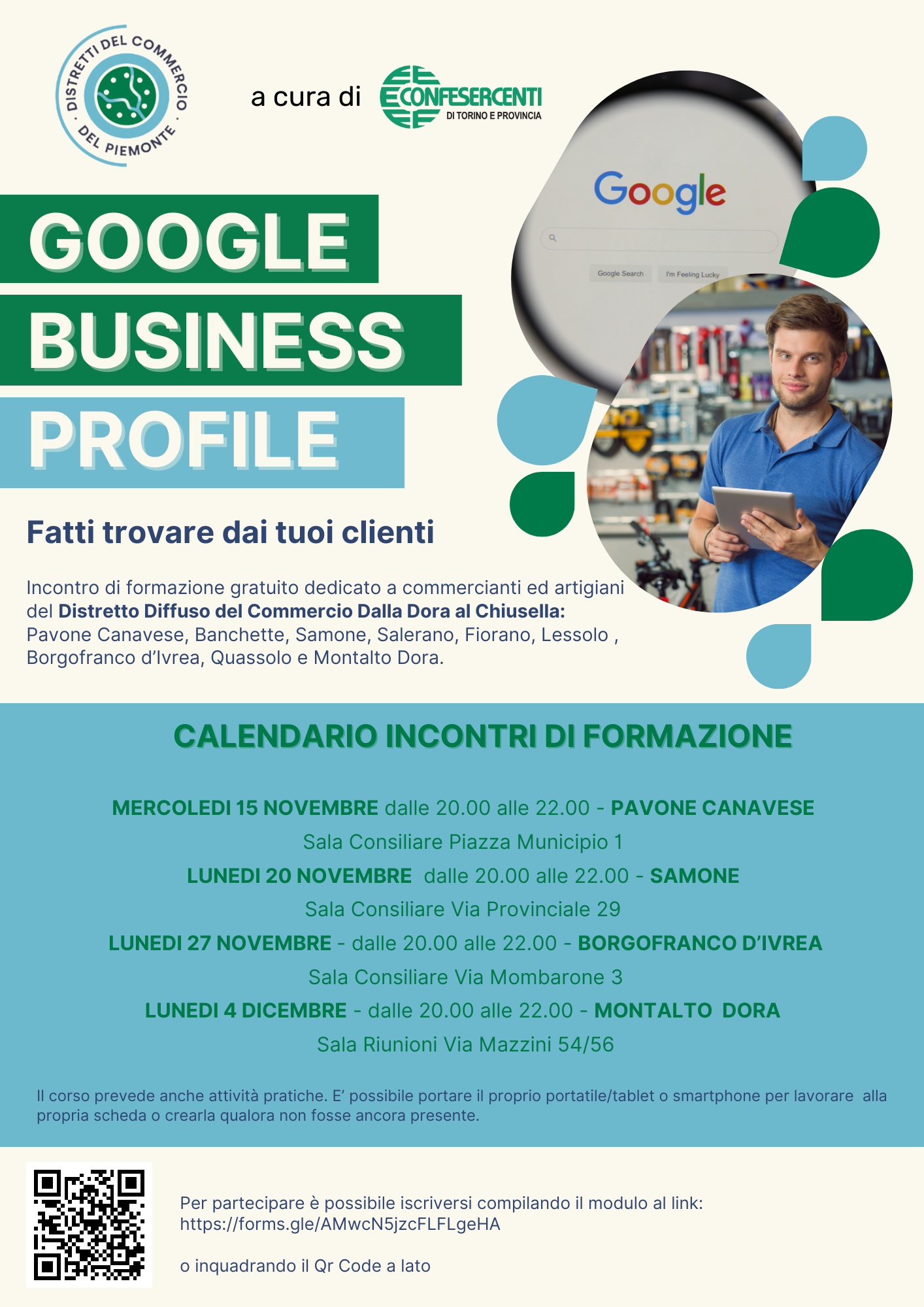 I Comuni del Distretto "Dalla Dora al Chiusella", in collaborazione con Confesercenti di Torino e Provincia, organizzano un nuovo ciclo di incontri formativi gratuiti rivolto ai propri commercianti e artigiani, a titolo "Google Business Profile".