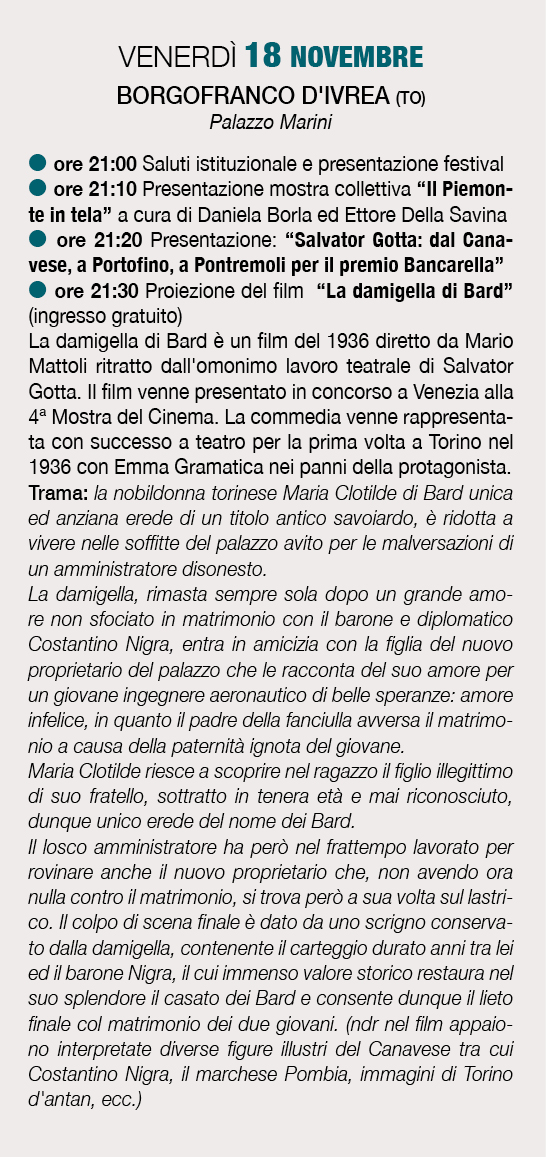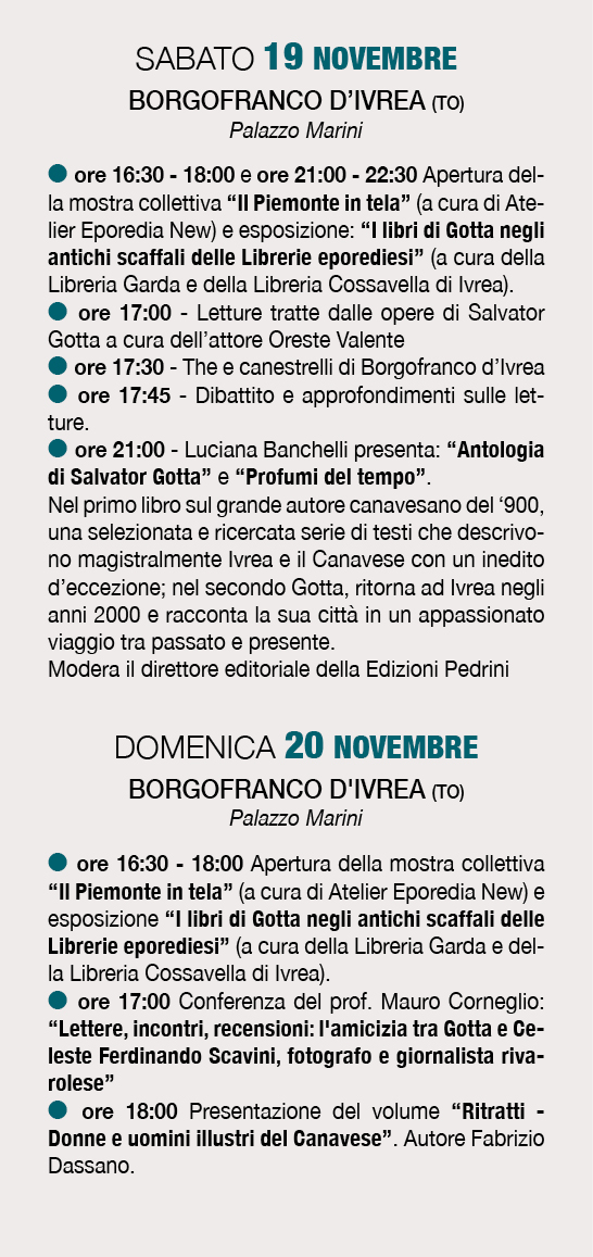 Si allega il programma del Festival "Figure dimenticate del Piemonte", l'evento organizzato dall'Ass. Luci che ha coinvolto numerosi partner e ha il Patrocinio di Enti istituzionali pubblici e privati. Il Festival vede il coinvolgimento di territori nell'alessandrino, vercellese, Ivrea e Canavese. L'intenzione è di accendere i riflettori sulle grandi figure del Canavese tra cui spicca nel suo 135° anniversario quello di Salvator Gotta, montaltese.