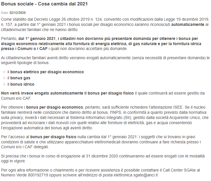 Si informa che dal 1° gennaio 2021, i cittadini non dovranno più presentare domanda per ottenere i bonus per disagio economico relativamente alla fornitura di energia elettrica, di gas naturale e per la fornitura idrica presso i Comuni o i CAF i quali non dovranno accettare più domande.
