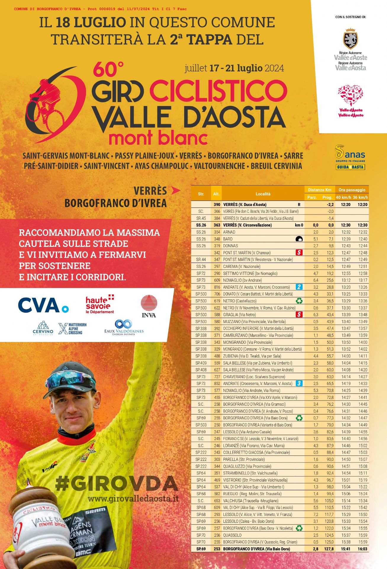 Si trasmette locandina del 60° Giro Ciclistico della Valle d'Aosta, del quale Borgofranco d'Ivrea sarà città di Tappa il giorno 18 Luglio 2024.