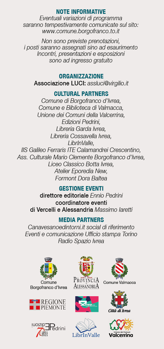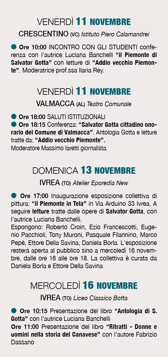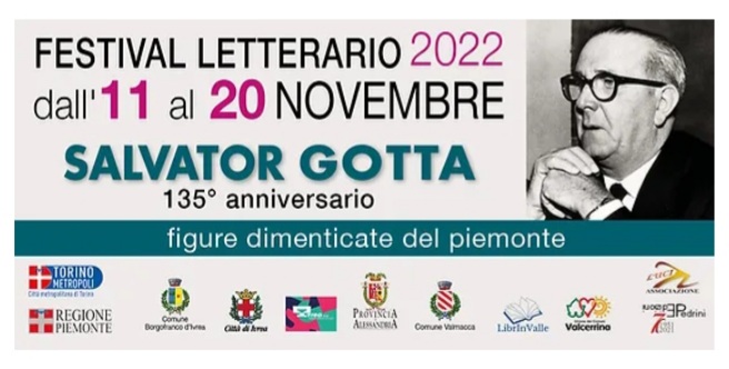 Si allega il programma del Festival "Figure dimenticate del Piemonte", l'evento organizzato dall'Ass. Luci che ha coinvolto numerosi partner e ha il Patrocinio di Enti istituzionali pubblici e privati. Il Festival vede il coinvolgimento di territori nell'alessandrino, vercellese, Ivrea e Canavese. L'intenzione è di accendere i riflettori sulle grandi figure del Canavese tra cui spicca nel suo 135° anniversario quello di Salvator Gotta, montaltese.